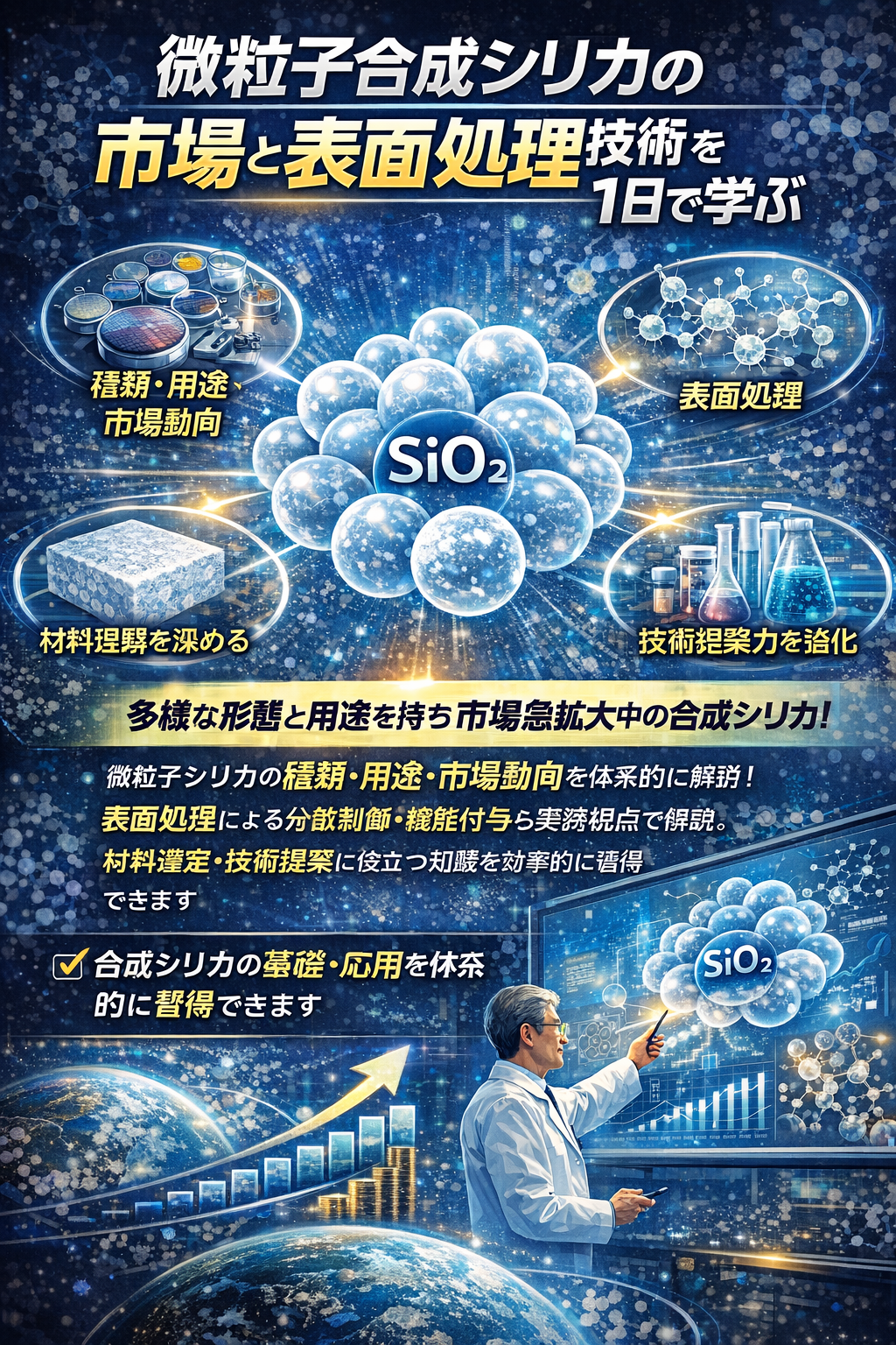 本セミナーでは、微粒子シリカの基礎から表面処理による機能発現、さらに市場動向やビジネス活用までを、実務に直結する形で短時間に効率よく習得いただけます。